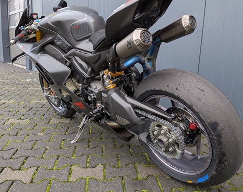 V4R Rennbike, mit kompletter Carbonverkleidung, außerdem in Carbon: Tankcover, Schwingenschutz, Rahmenschutz.